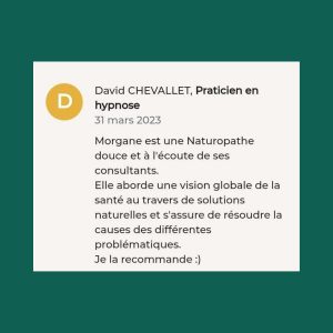 RAPPEL IMPORTANT : La naturopathie est une méthode non conventionnelle qui ne se substitue pas à la médecine. Suivre mes conseils de naturopathe ne dispense en aucun cas de consulter et/ou de suivre un traitement allopathique prescrit par un médecin. Mes techniques sont complémentaires et visent à vous apporter plus de vitalité et de bien-être en vous comprenant mieux.